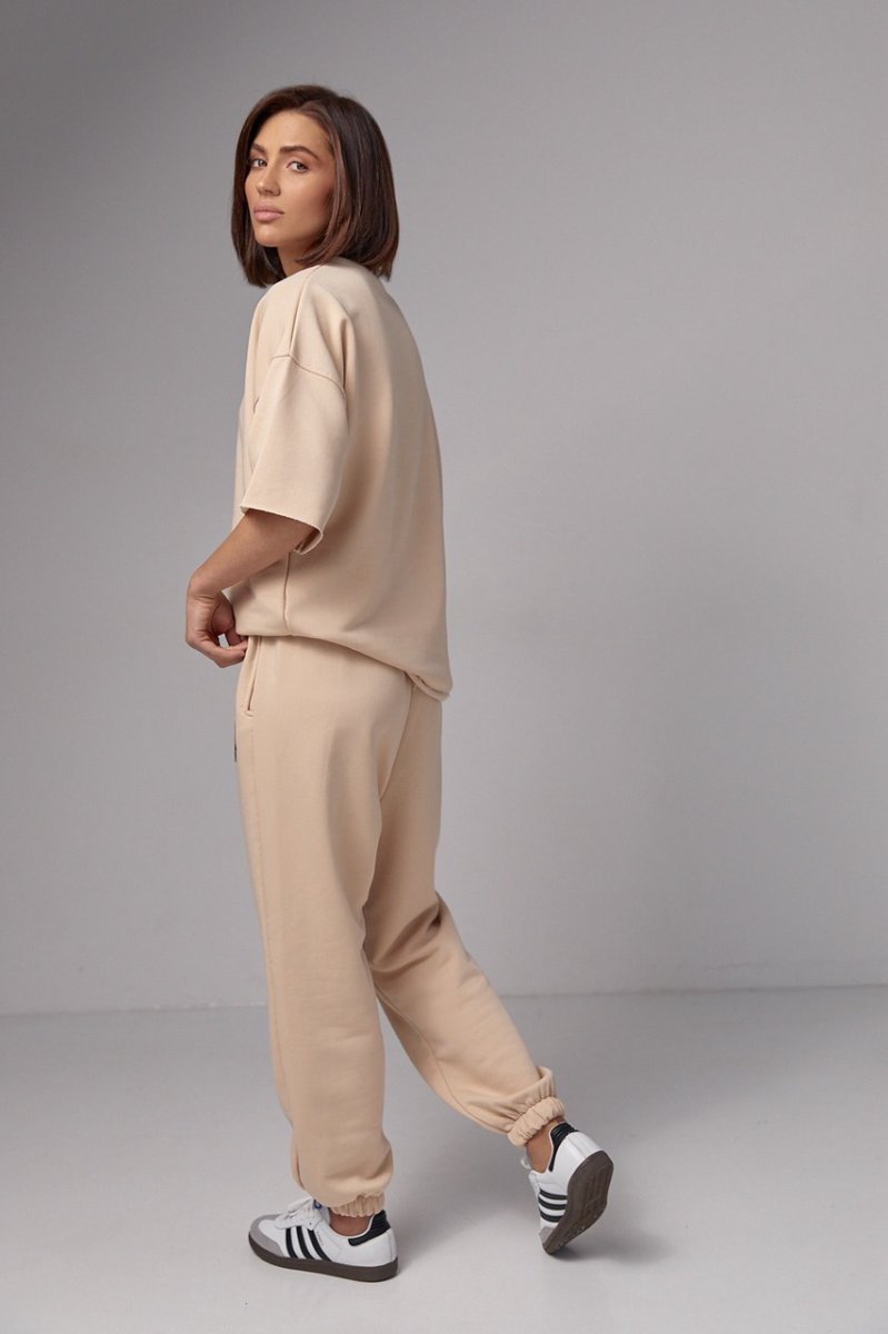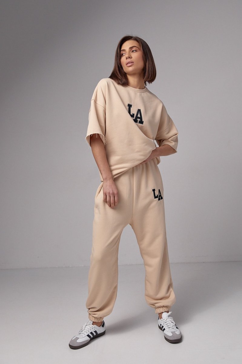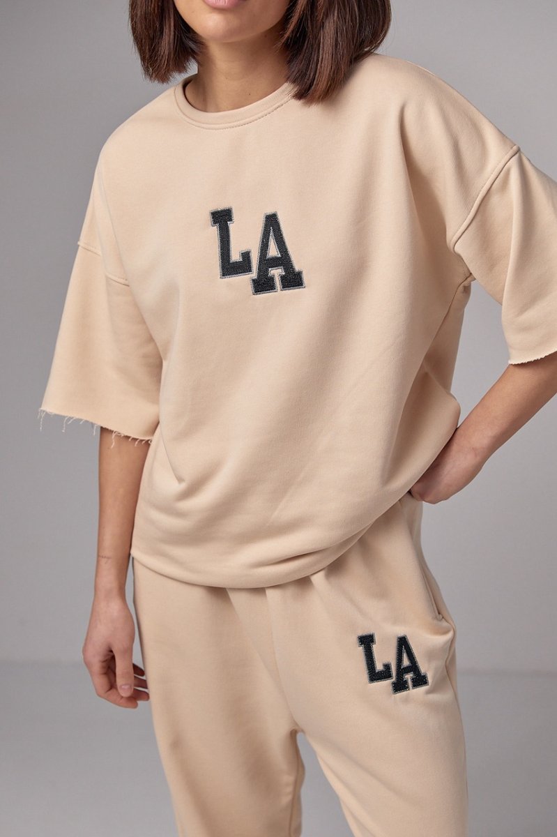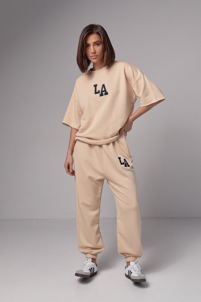 В этот комплект входит свободная футболка и спортивные штаны-джоггеры. В футболке прямой крой, рукава и низ имеют необработанный край. Круглая горловина дополнена окантовкой. Спереди расположен вышитая надпись LA. Штаны внизу и вверху собраны на широкую резинку. В боковых швах расположены удобные прорезные карманы. С левой стороны штаны украшает вышитая надпись аналогична той, что на футболке.