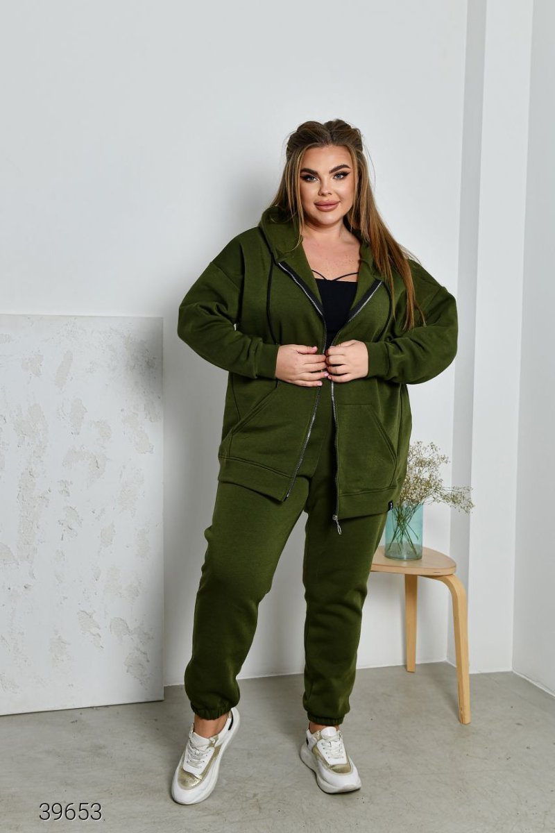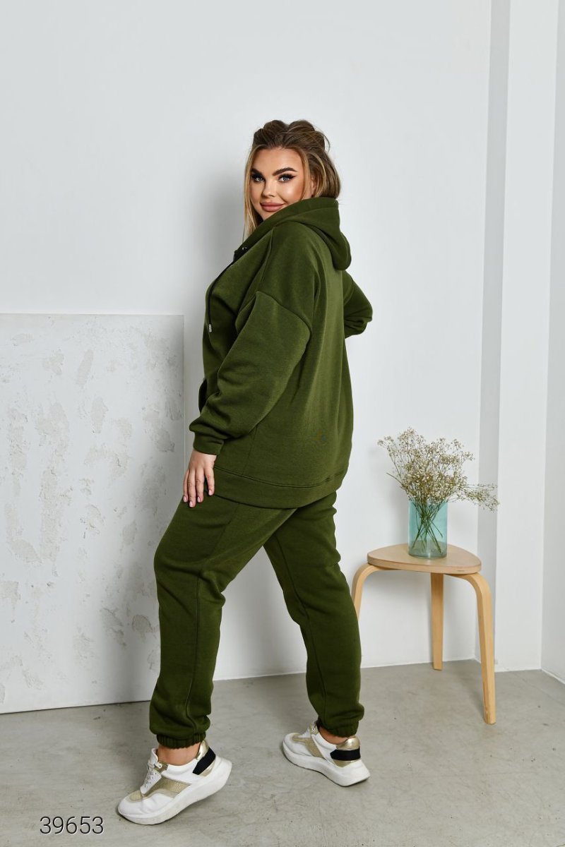 Женский теплый костюм. Кофта с капюшоном, в кулиску которого продет шнурок. Линия плеча спущена, накладные карманы «кенгуру». Штаны с посадкой выше средней. По талии на резинке. В боковых швах карманы. Низ штанин на резинке. Ткань: трикотаж трёхнить с начёсом.