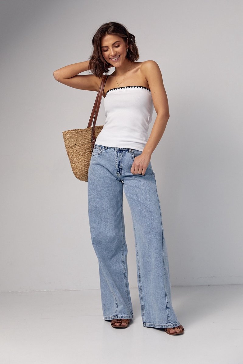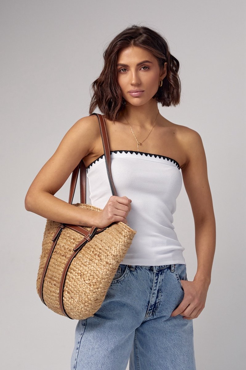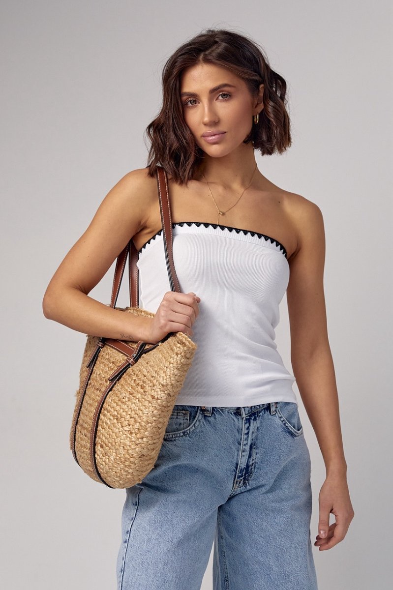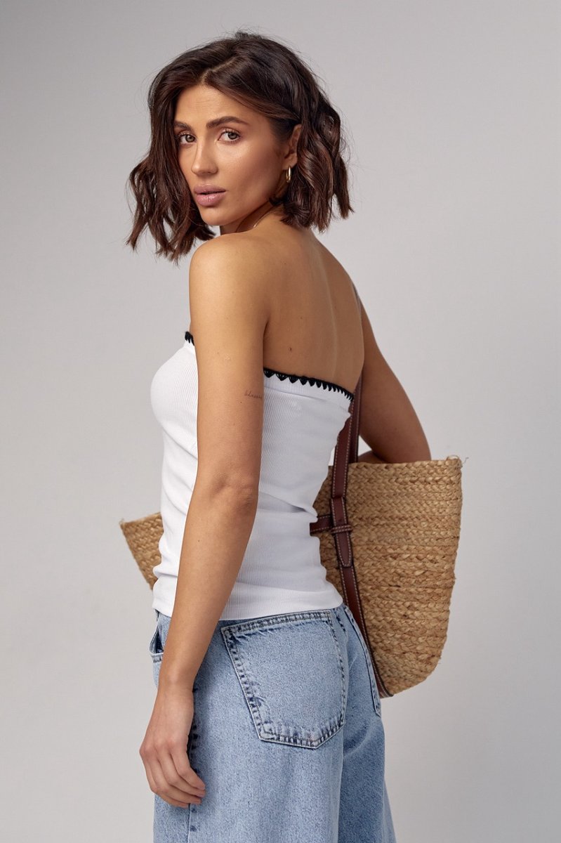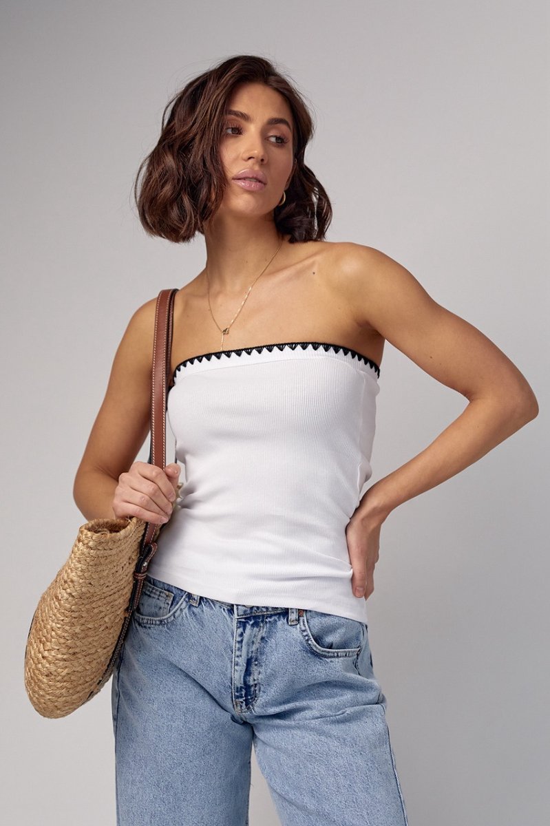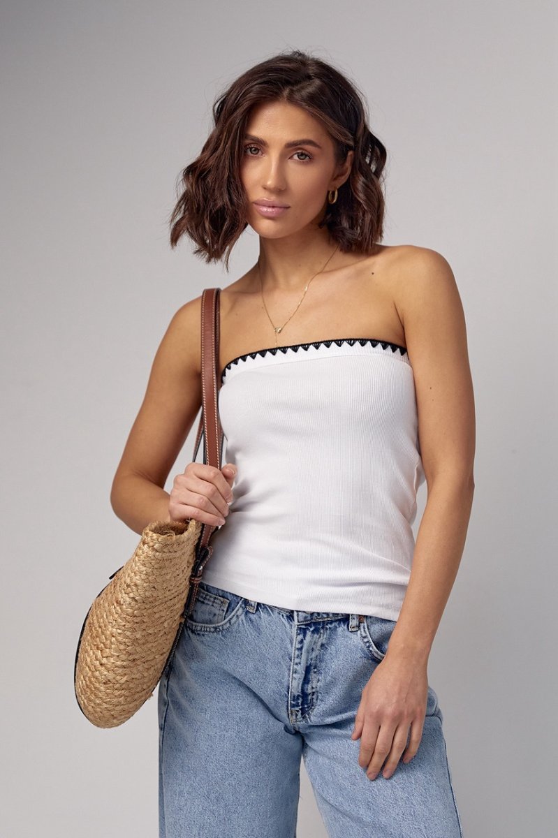 Модель отлично садится по фигуре благодаря эластичному материалу в рубчик. Верх топа дополнен окантовкой с основной ткани, которая имеет вышивку зигзаг. Асимметричный низ в виде удлиненной одной стороны, придает образу игривость и нестандартность.