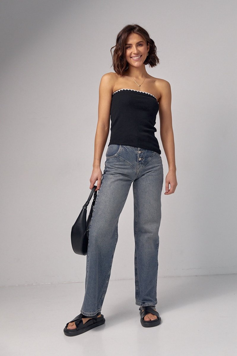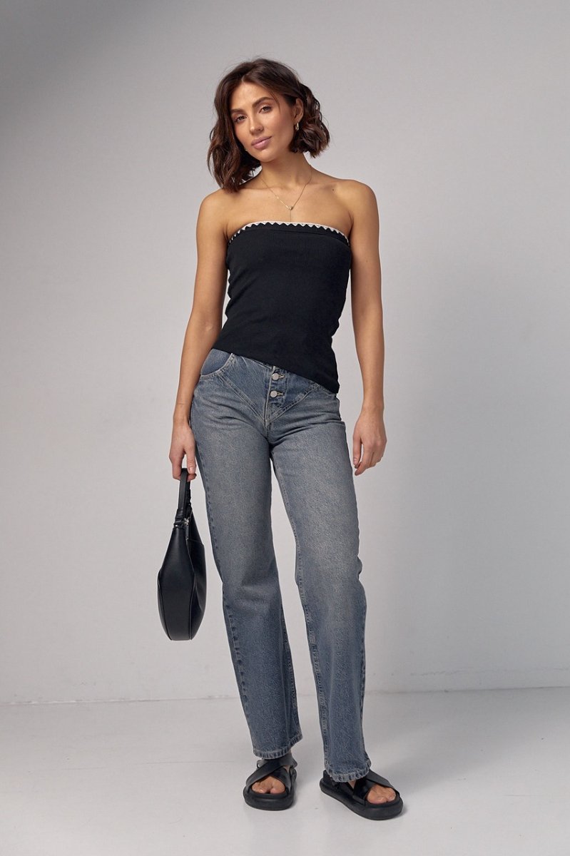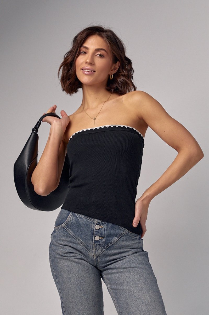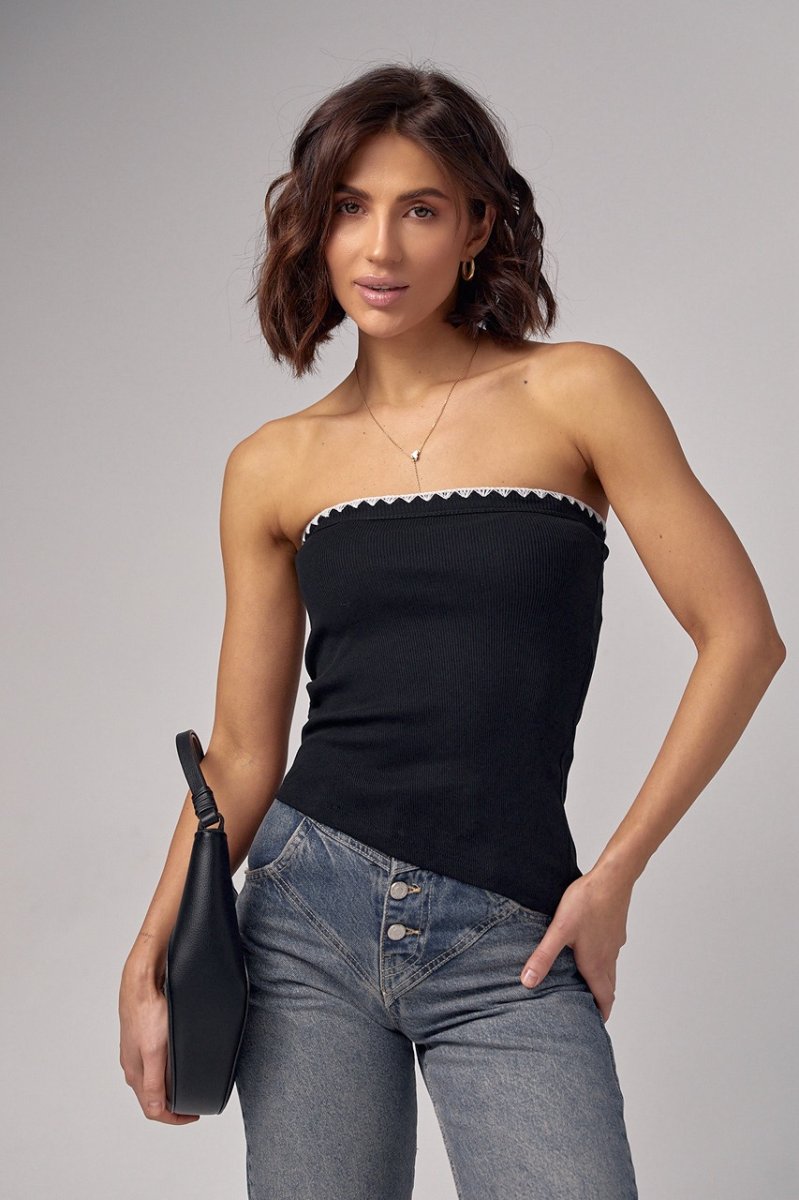 Модель отлично садится по фигуре благодаря эластичному материалу в рубчик. Верх топа дополнен окантовкой с основной ткани, которая имеет вышивку зигзаг. Асимметричный низ в виде удлиненной одной стороны, придает образу игривость и нестандартность.