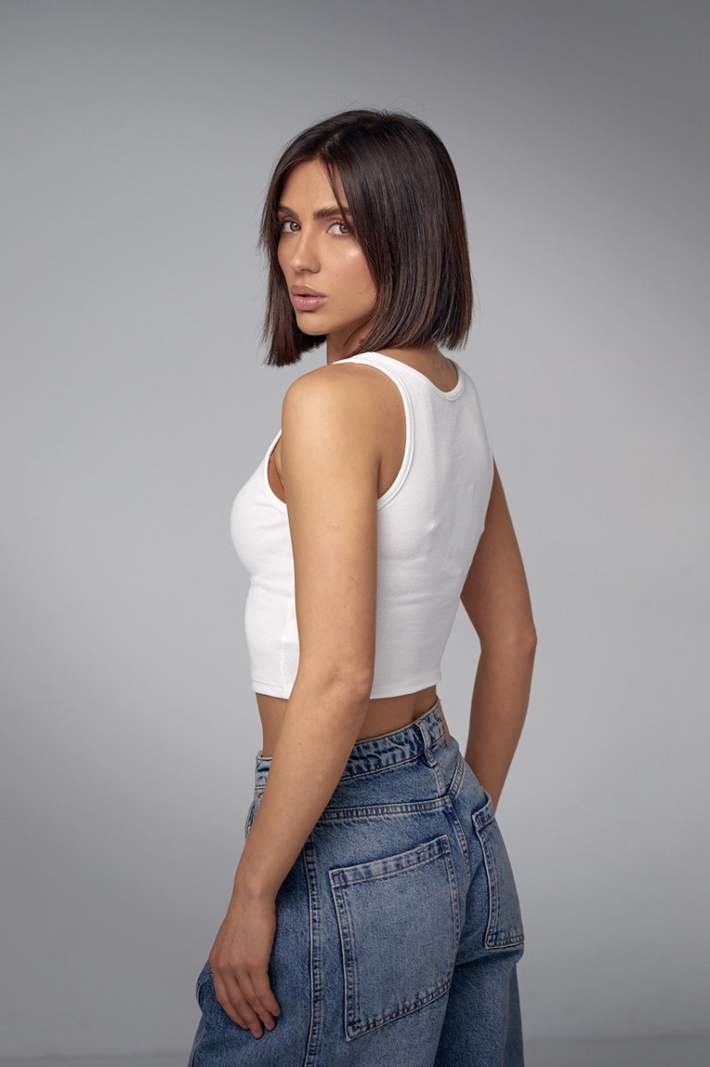 Как база под оверсайз рубашки, объемные жакеты или как самостоятельный верх – эта трикотажная майка в рубчик впишется в самые разнообразные наряды. И да, ее можно сочетать с одеждой абсолютно любых расцветок.