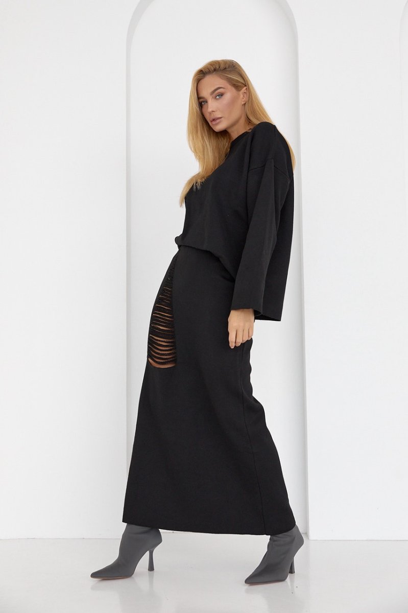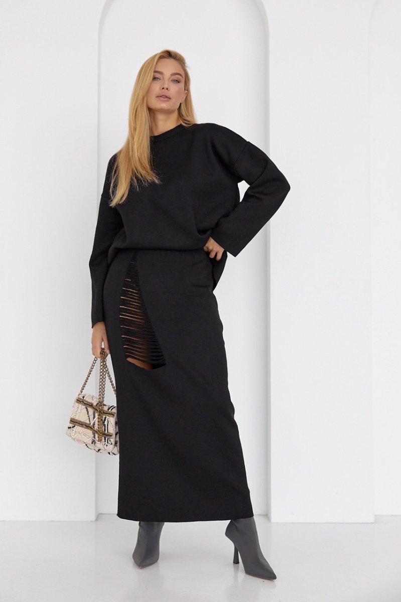 Оригинальный костюм-двойка, состоящий из свободного джемпера и прямой юбки с распоркой -  твой готовый к выходу look, который ты также можешь комбинировать с другой модной одеждой.