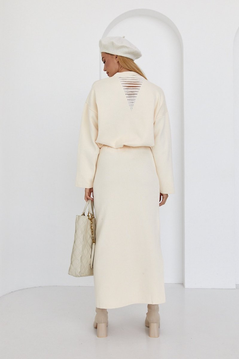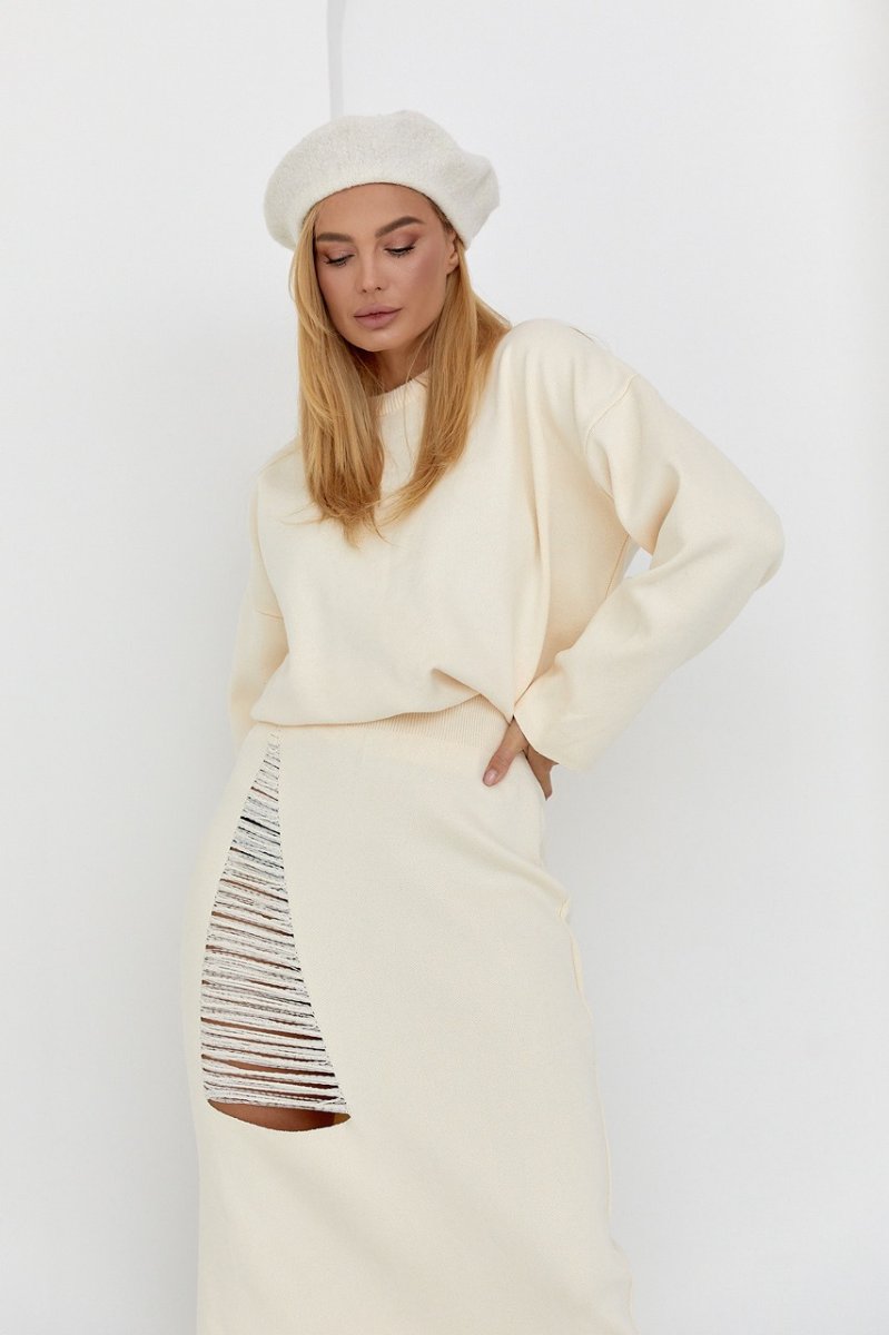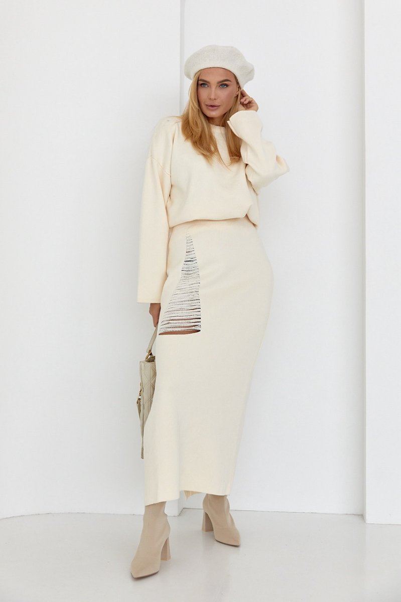 Оригинальный костюм-двойка, состоящий из свободного джемпера и прямой юбки с распоркой -  твой готовый к выходу look, который ты также можешь комбинировать с другой модной одеждой.