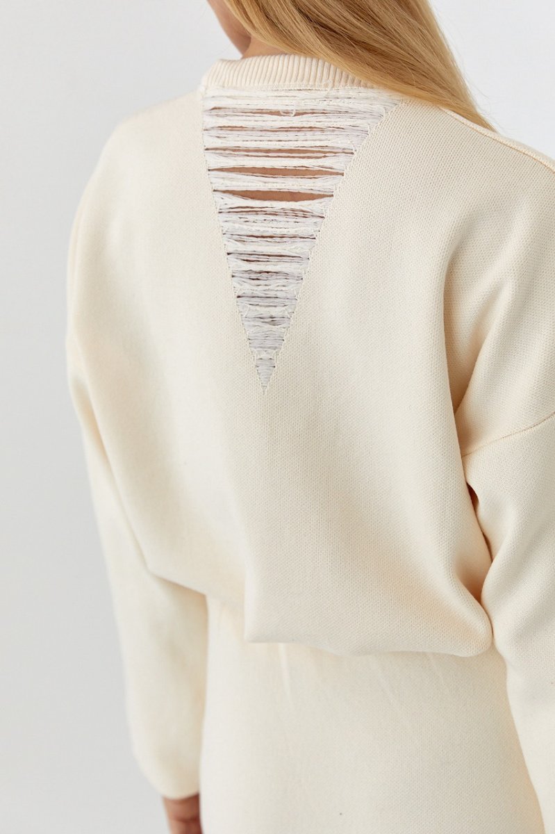 Первая причина влюбиться в нашу новинку – приятная на ощупь ткань. Вторая – идеальный oversize крой, который не только на пике популярности, но и подарит максимум комфорта. Третья причина - оригинальный декор в виде вырезов на юбке и спинке джемпера с нитками, которые расположены рядами. И, наконец, четвертая причина – возможность носить отдельно каждую вещь и получить еще больше вариантов впечатляющих образов!