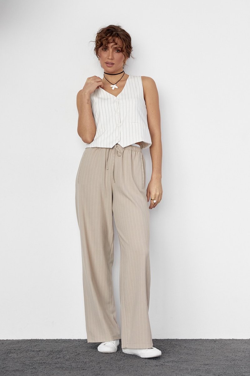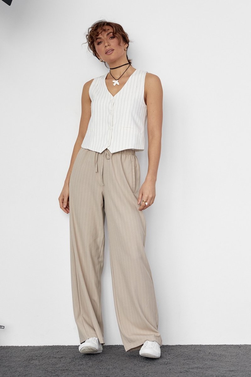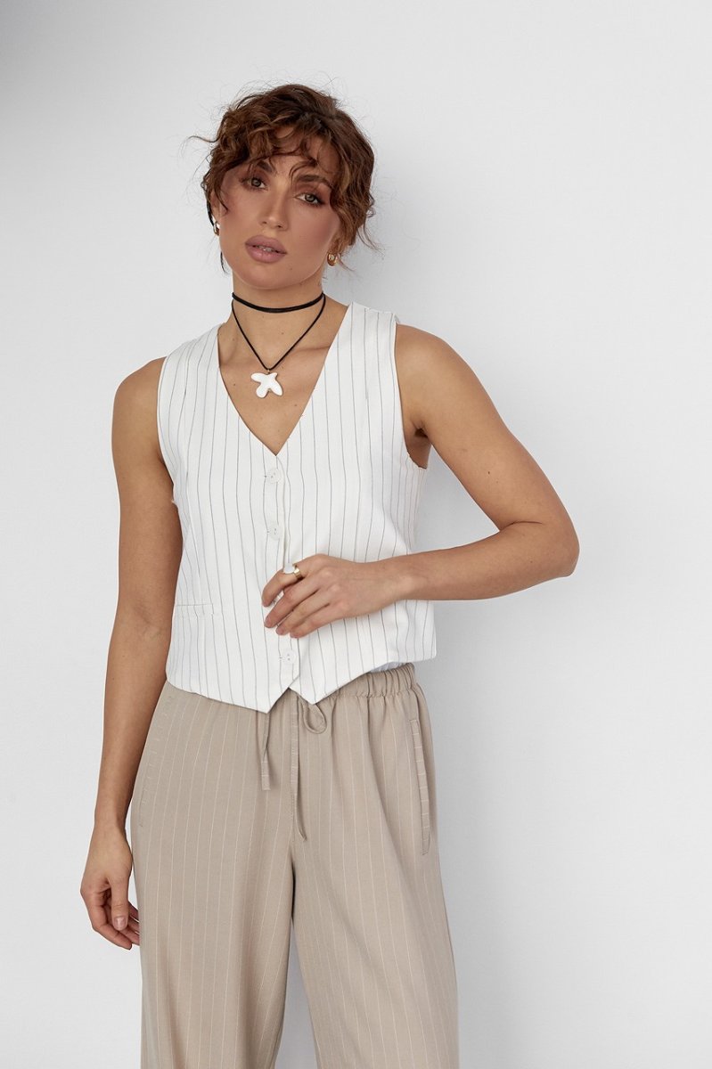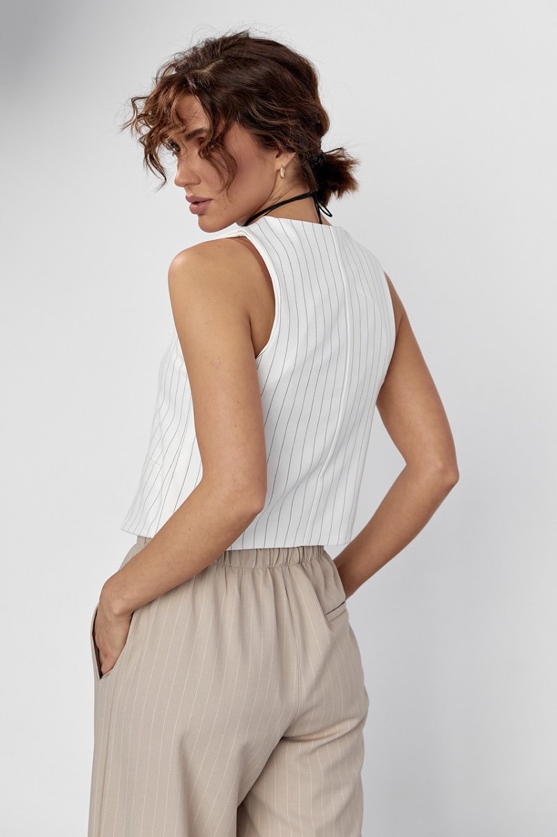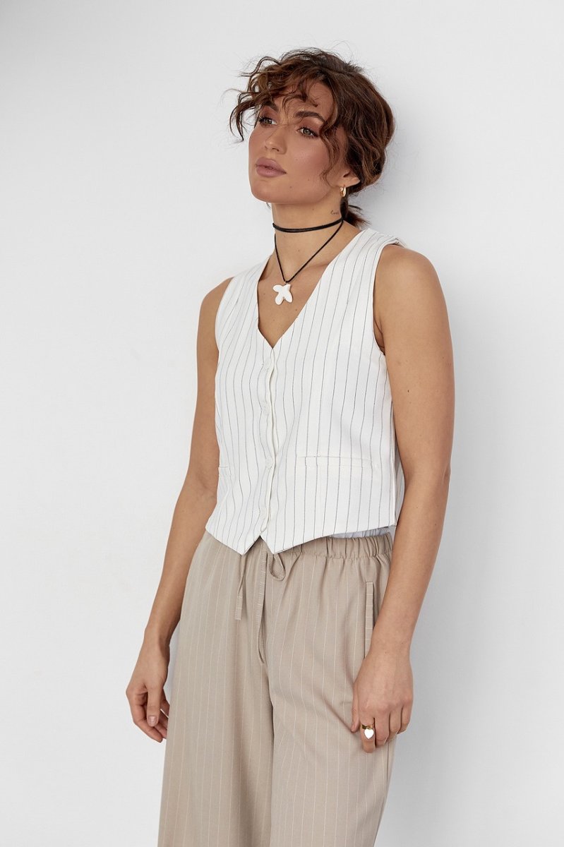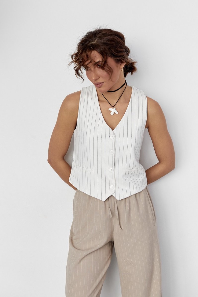 Создавать элегантные образы и для рабочих будней, и для особого случая тебе поможет стильный женский жилет из костюмной ткани в полоску.