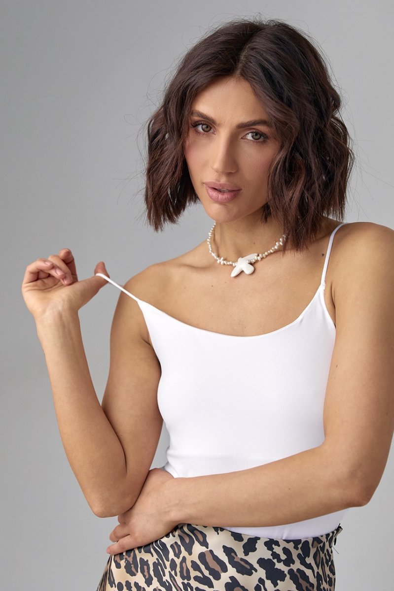 Эта модель выполнена из эластичной ткани, которая хорошо тянется. Низ изделия застегивается на кнопки. Тонкие бретели-резинки идут без регулировки длины. Спереди и сзади боди дополнено короткой подкладкой с основной ткани, которая позволяет изделию не просвечивается.