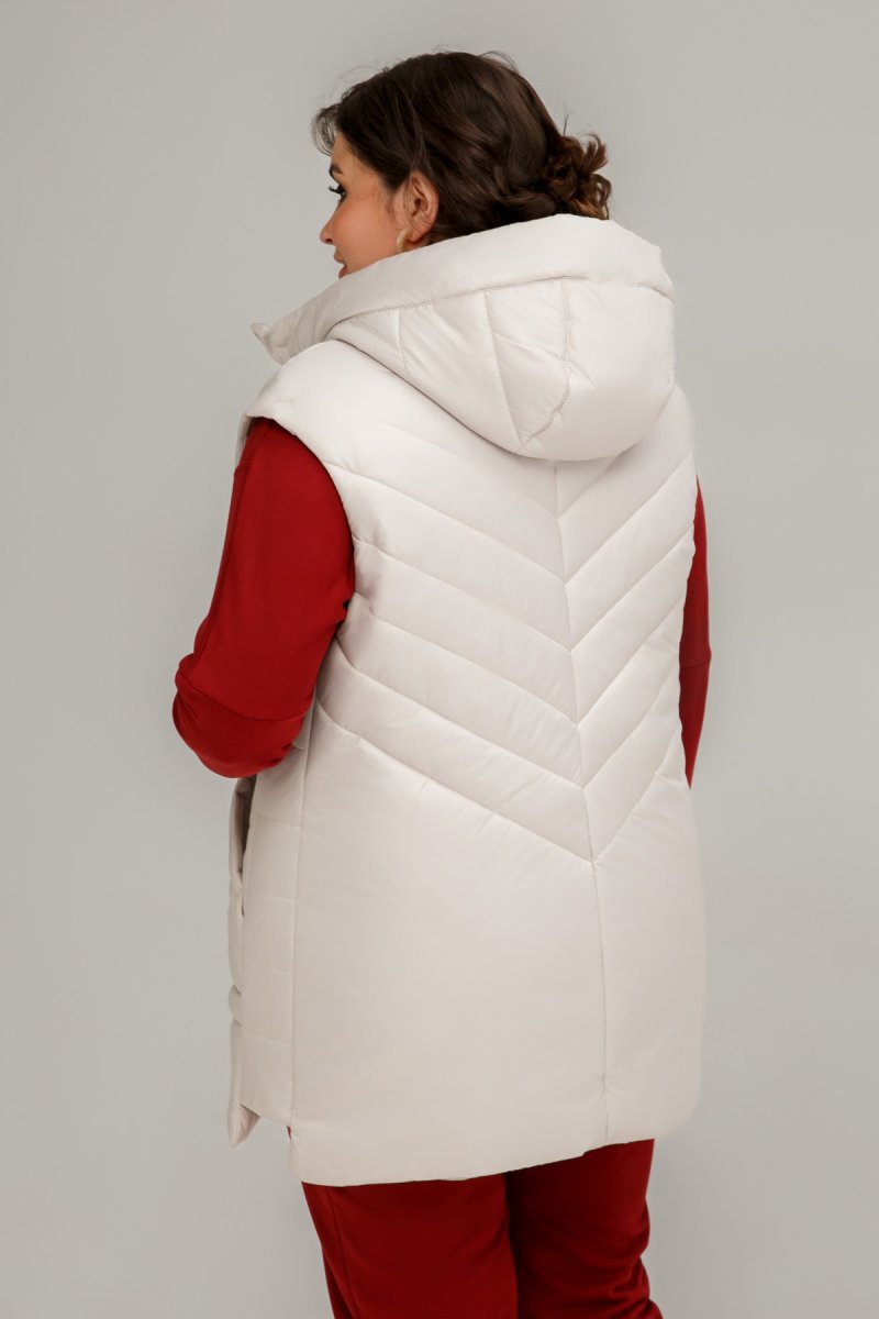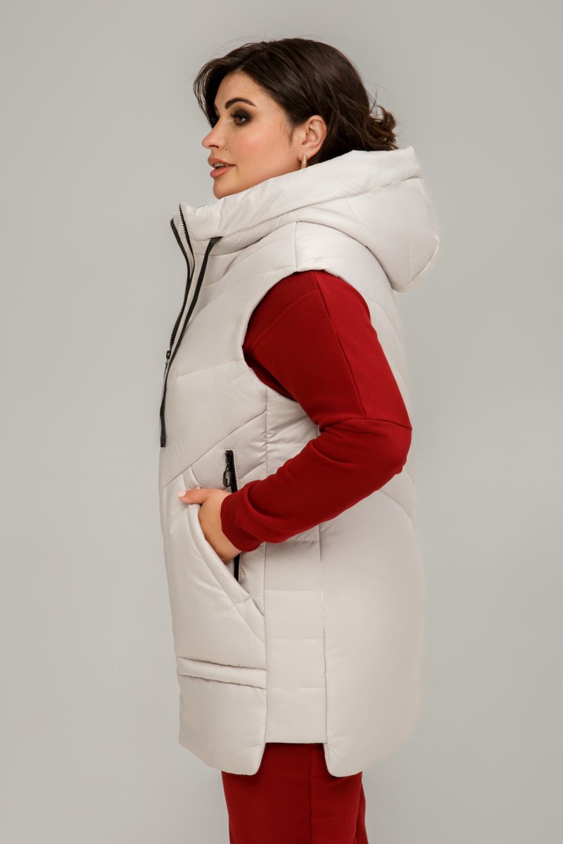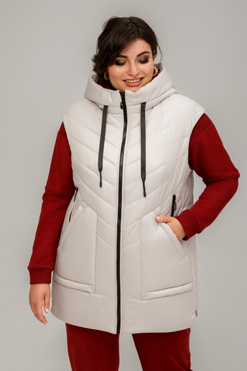 Жилет прямого силуэта из стёганной плащевой ткани. Застежка на молнию. Высота капюшона регулируется при помощи шнурка. По полочке выполнены накладные карманы декорированные закрепками и дополнительными, функциональными карманами на змейке.