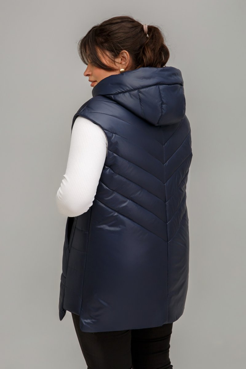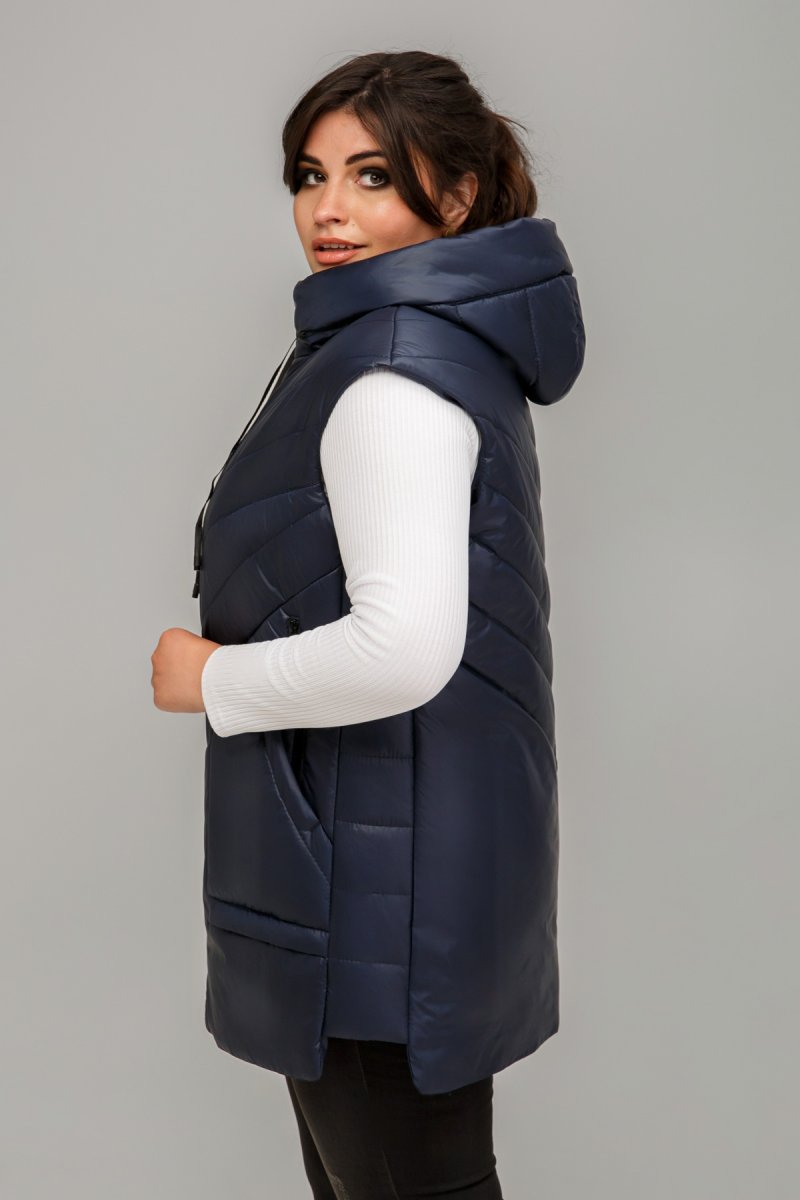 Жилет прямого силуэта из стёганной плащевой ткани. Застежка на молнию. Высота капюшона регулируется при помощи шнурка. По полочке выполнены накладные карманы декорированные закрепками и дополнительными, функциональными карманами на змейке.
