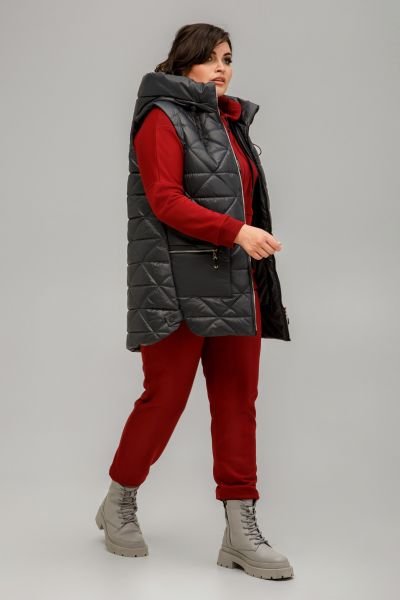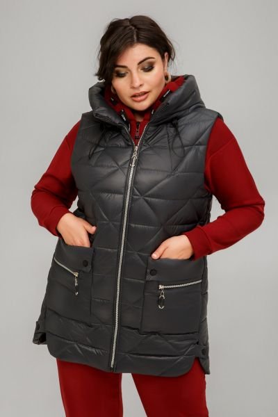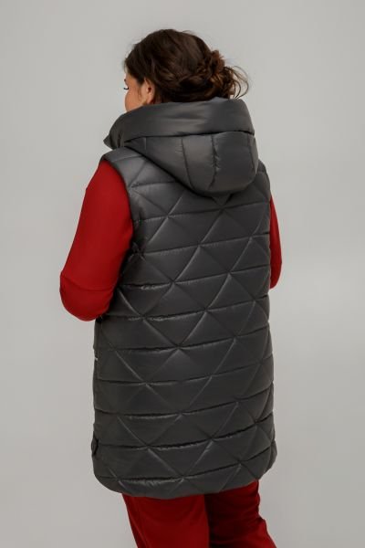 Жилет прямого силуэта из стеганной плащевки. Боковой шов выполнен по диагонали, с плавным смещением в сторону полочки. Глубина капюшона регулируется резинкой с зажимами. Карманы накладные, клапан декорирован кнопкой, карман – молнией. В нижней части, по обе стороны, выполнены разрезы с патом на кнопку. Подкладка – нейлон.