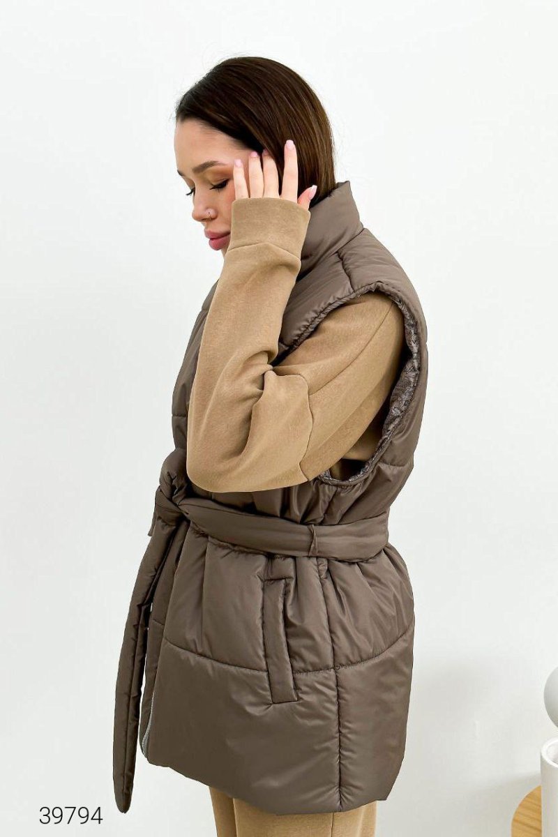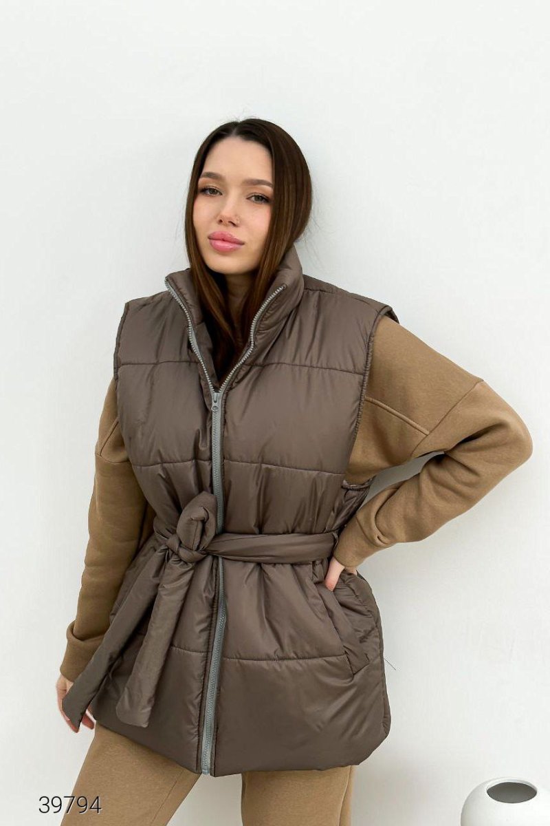 Жилет женский стеганый. Застегивается на молнию, в комплекте пояс. Есть карманы. Ткань: водоотталкивающая плащевка с подкладом, утеплитель силикон 200 г.м2