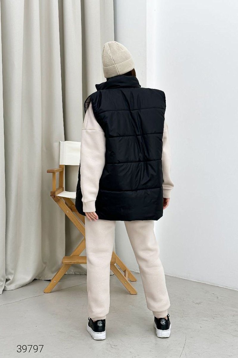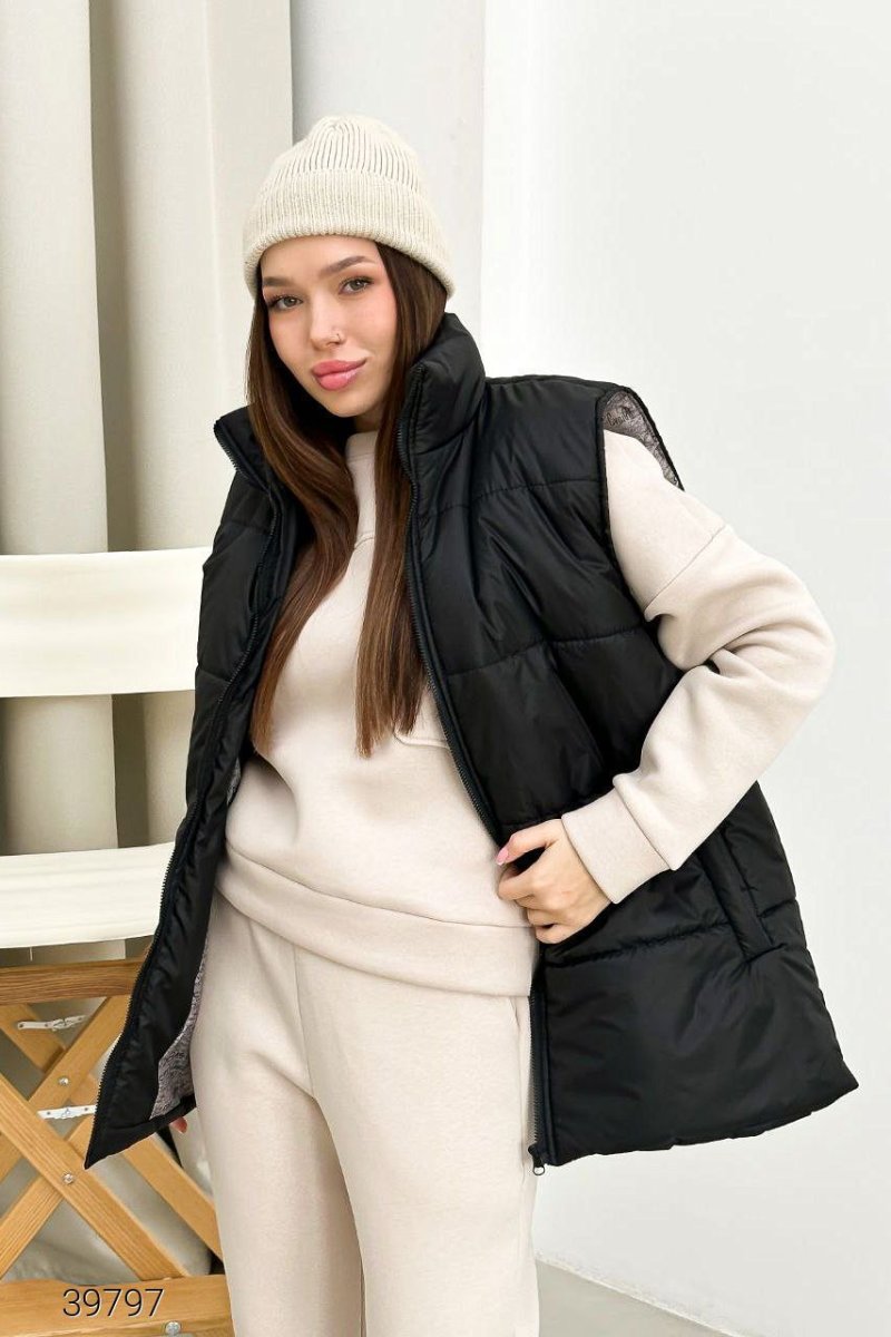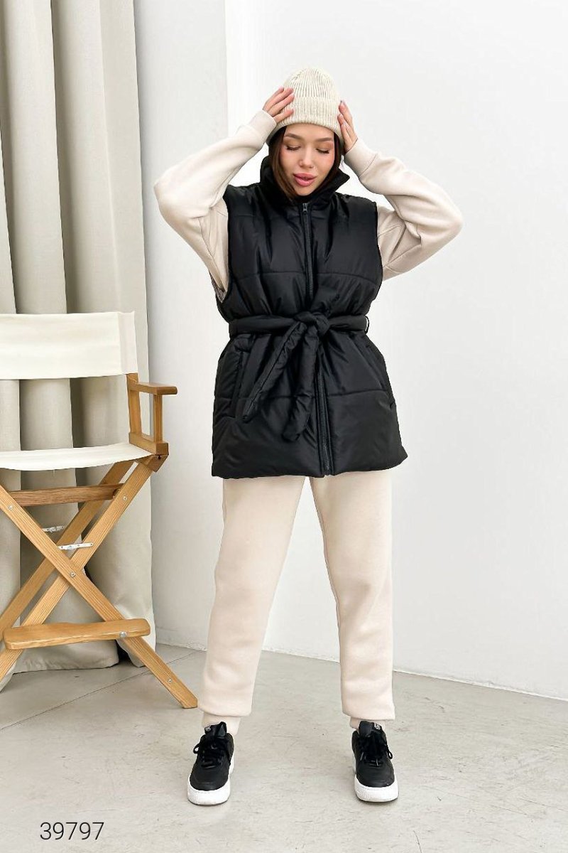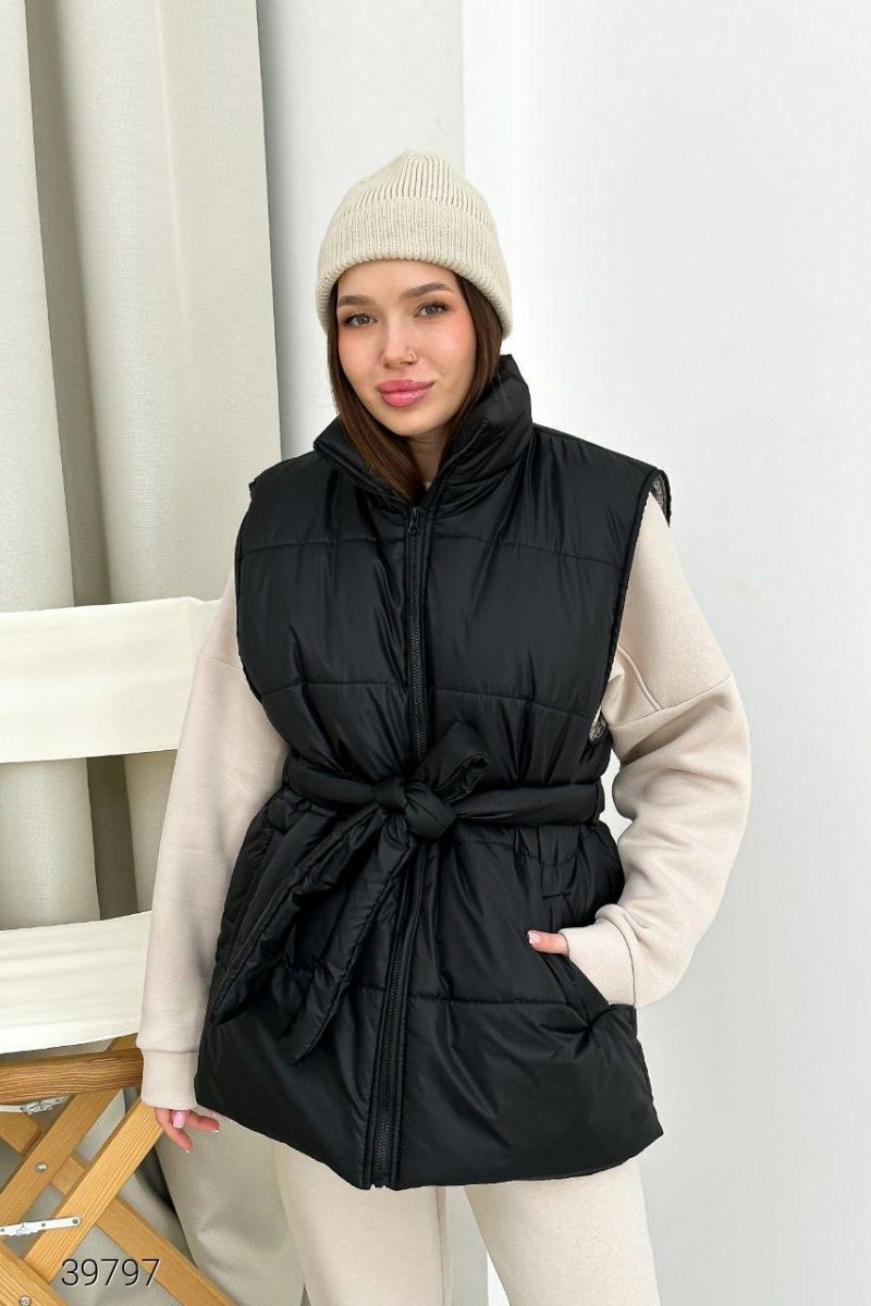 Жилет женский стеганый. Застегивается на молнию, в комплекте пояс. Есть карманы. Ткань: водоотталкивающая плащевка с подкладом, утеплитель силикон 200 г.м2