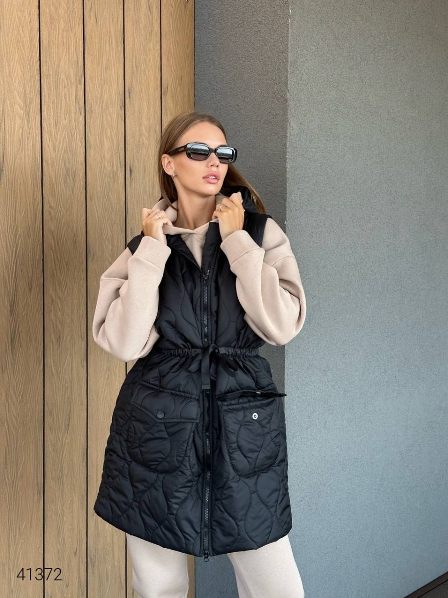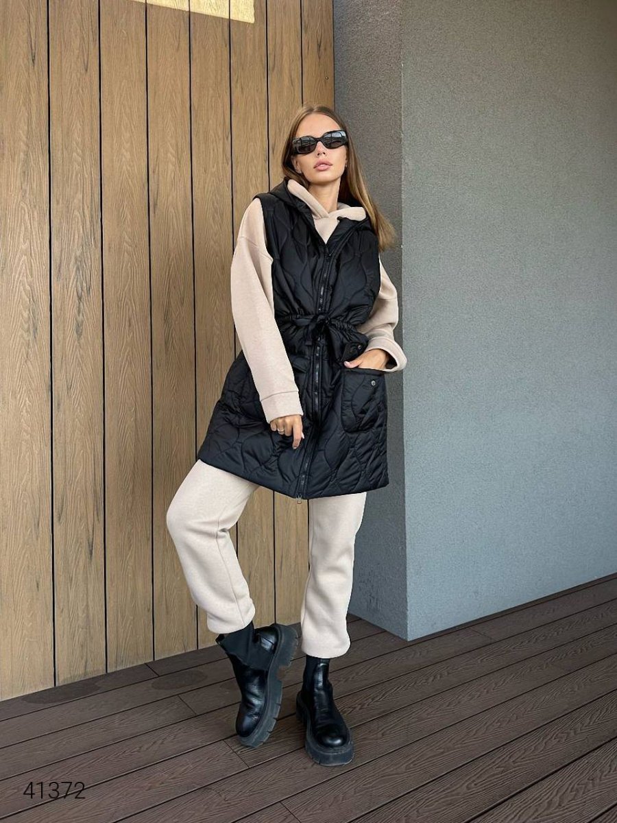 Жилет женский удлиненный с капюшоном. Свободный крой, талия на кулиске. Имеет удобные накладные карманы с клапанами на кнопках. Ткань: плащевка стёганая с подкладом, утеплитель 150 г.м2. Один универсальный размер 42-48.