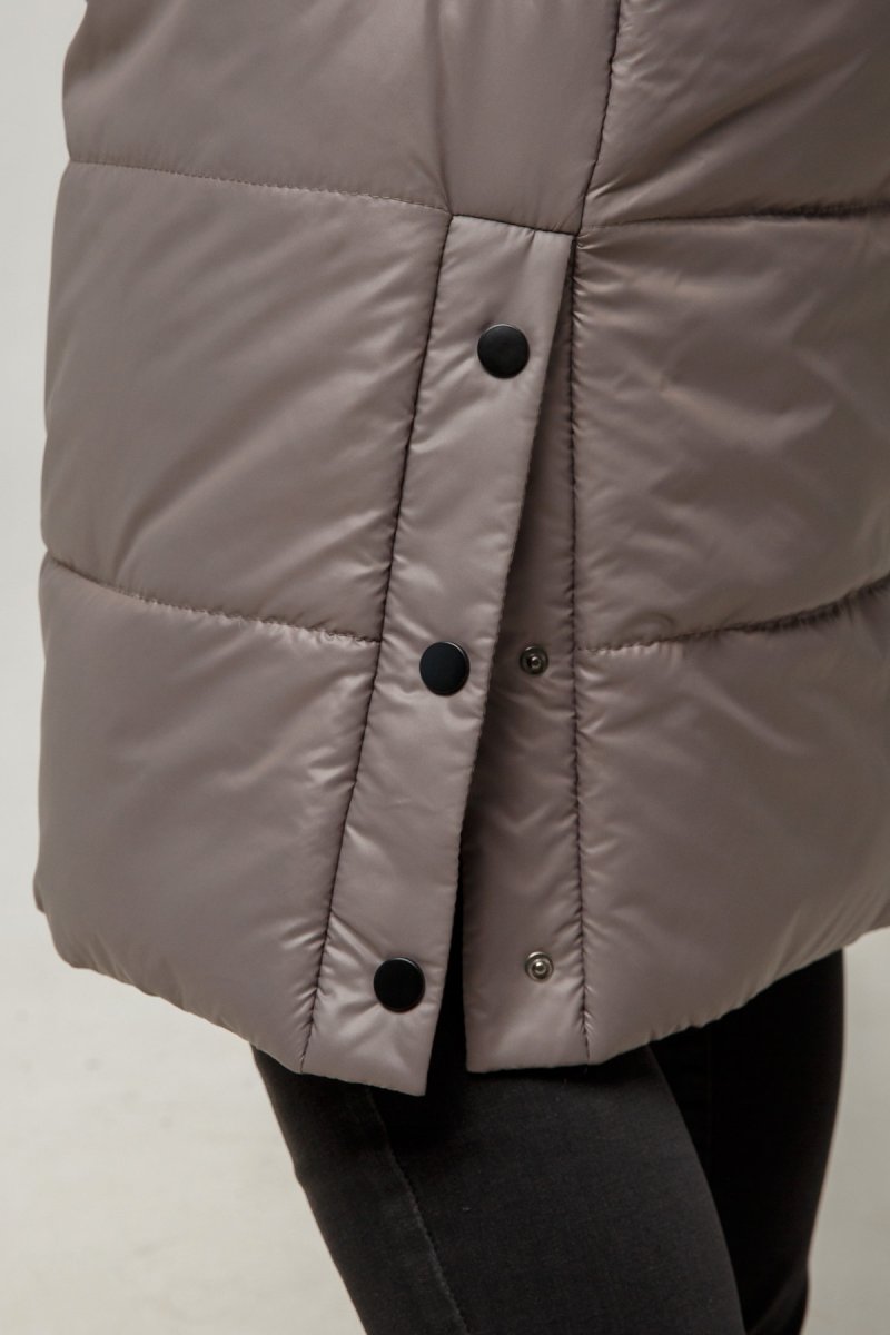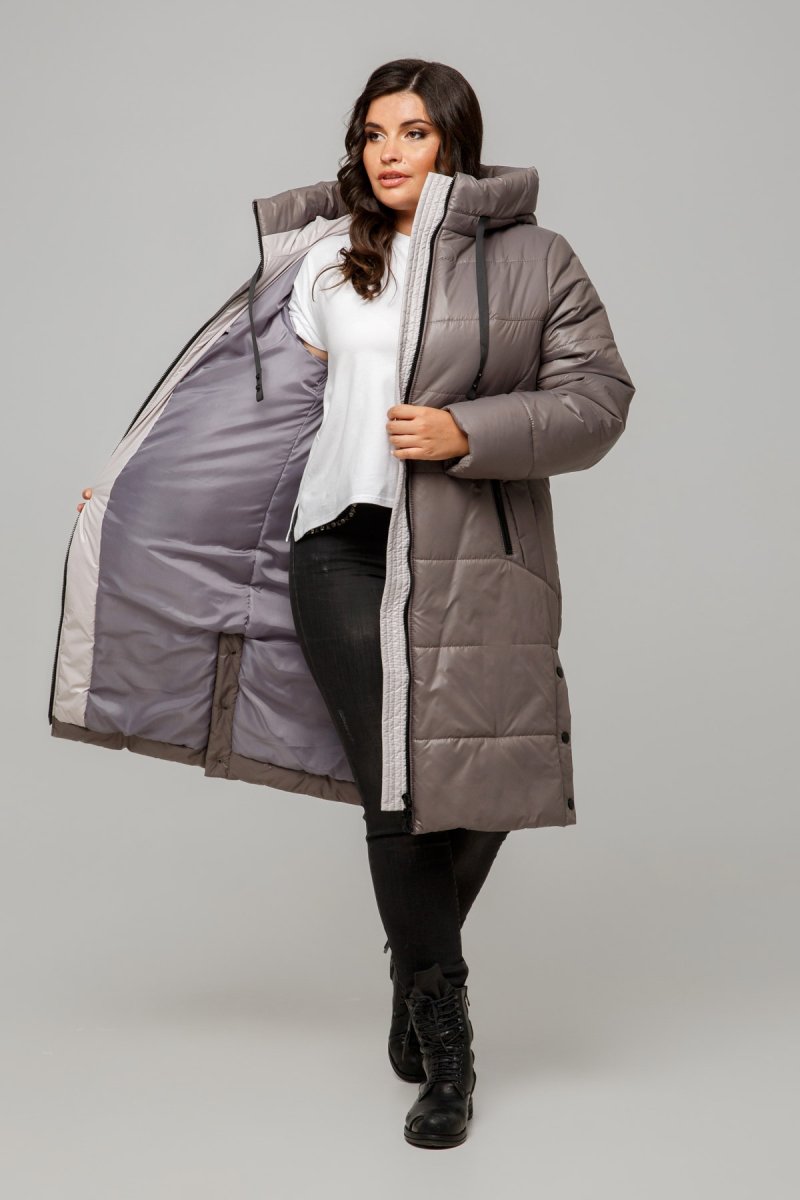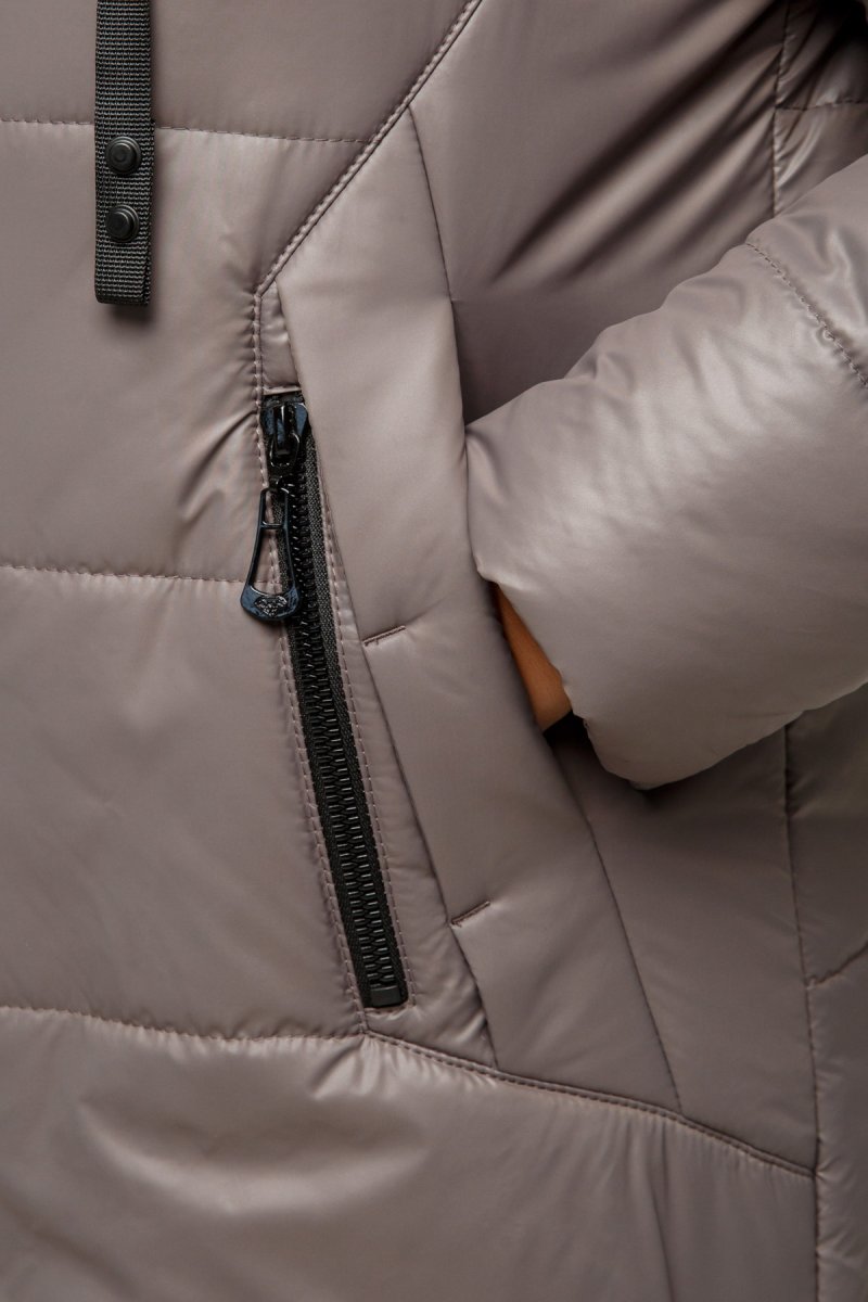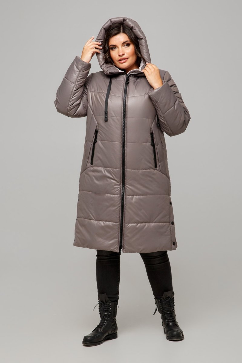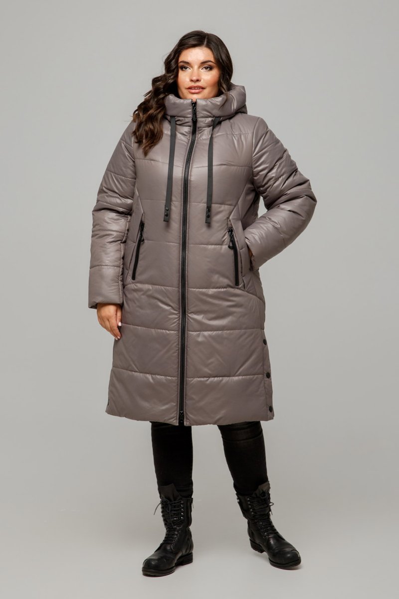 Зимнее пальто прямого силуэта с застёжкой на молнию. Рукава втачные двухшовные . По полке подрезы, в которых выполнены карманы с клапанами, декорированы закрепками и змейками. В боковых швах - шлицы с застёжкой на кнопки. Капюшон втачной, высота регулируется при помощи шнура.