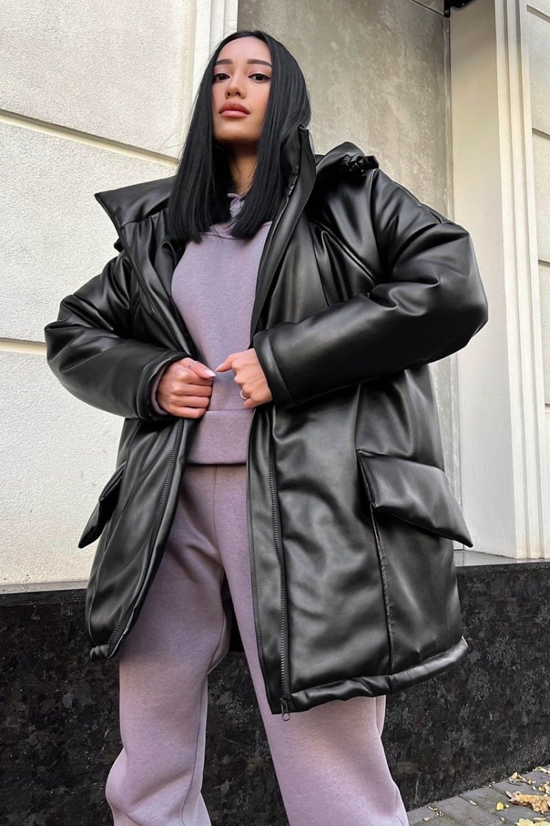 Невероятный тренд 22/23 – теплая дутая куртка oversize из гладкой экокожи на силиконе. Материал не пропускает влагу, создавая комфорт в непогоду. Объемный капюшон на завязках и завязки-шнурки на нижней кромке обеспечивают дополнительную защиту от ветра. Комфортная теплая куртка с снимаемым капюшоном поможет сделать ярче и уютнее каждый ваш прохладный день. Куртка дополнена длинными рукавами с приспущенной линией плеч и удобными карманами. Модель застегивается на змейку спереди.