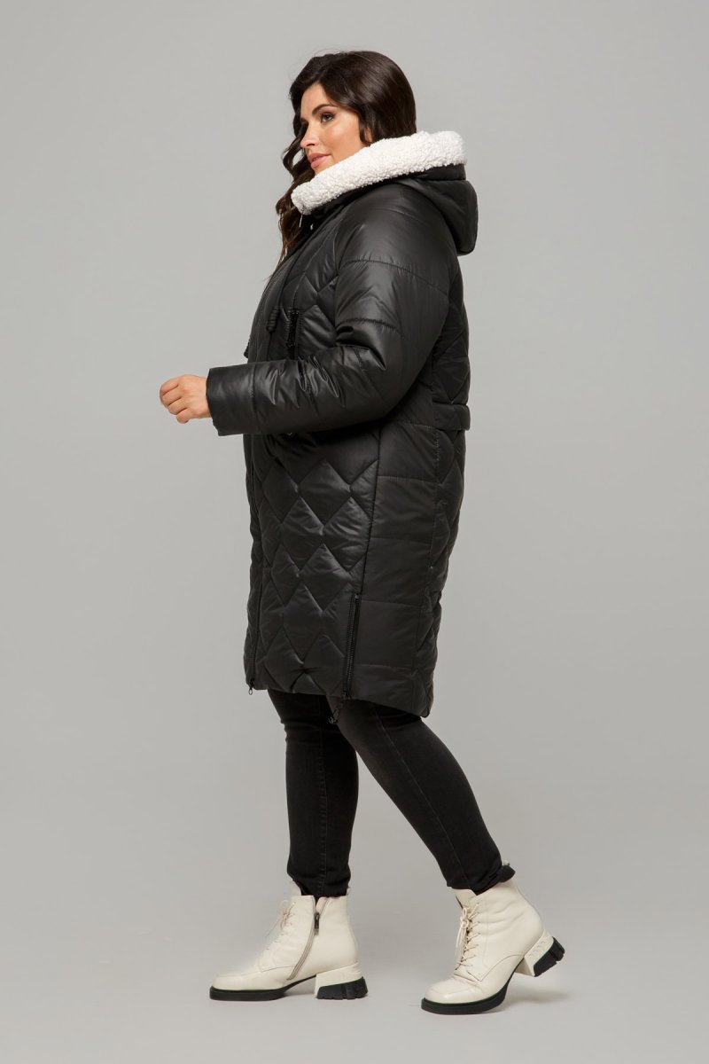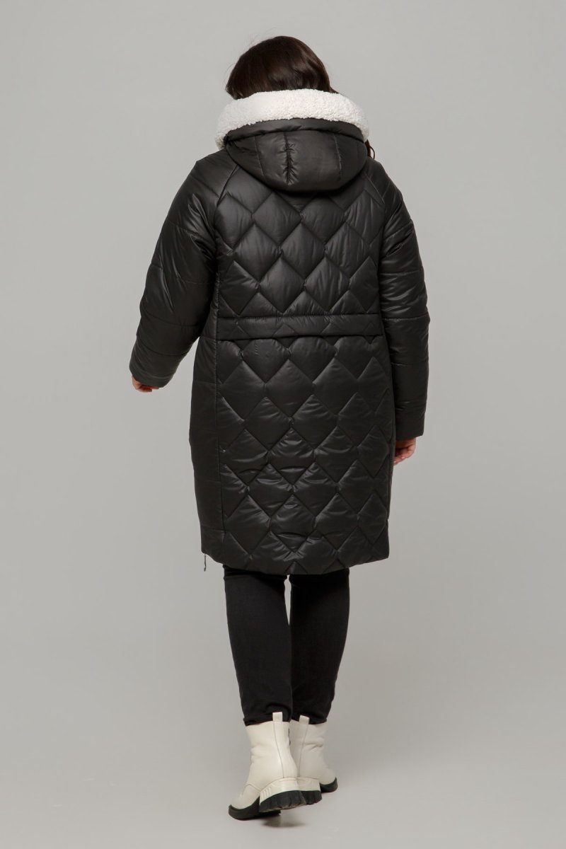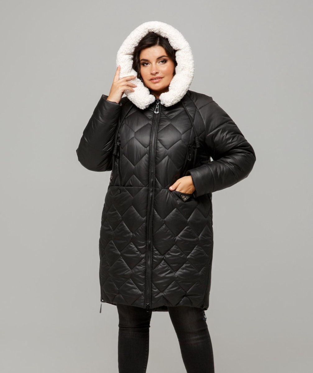 Зимняя куртка прямого силуэта ,зауженная книзу. В рельефных швах полки выполнены карманы на молнию, по линии талии - карман на кнопку. Боковые швы внизу декорированы молнией. Спинка отрезная по линии талии с имитацией отлетной кокетки.