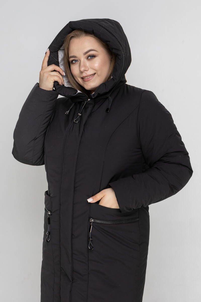 Стильное зимнее пальто прямого силуэта для обладательниц пышных форм. Изделие имеет вшитый капюшон с кулиской. Пальто женское застегивается на молнию и планку с кнопками.